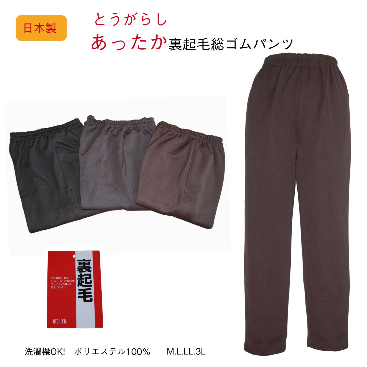 商品説明 ウエスト/総ゴム (ゴム替え口はありません) ポケット/右側1個 混率/ポリエステル100% 生産国/日本 カラー/ブラウ・グレー・ブラック 概要 寒い季節を快適に過ごすための「うら起毛カプサイシン加工フリーパンツ」は、裏起毛素材とカプサイシン加工により、あたたかなはき心地が楽しめるだけでなく、ゆったりシルエットが特徴で、リラックスしたひとときを過ごすための日常着や作業着にもぴったりです。 サイズ ●M ウエスト64.0-70.0 ヒップ87.0-95.0 股下60.0 ●L ウエスト69.0-77.0 ヒップ92.0-100.0 股下60.0 ●LL ウエスト77.0-85.0 ヒップ97.0-105.0 股下60.0 ●3L ウエスト85.0-93.0 ヒップ102.0-110.0 股下60.0 上記のサイズは、スタッフによる平置きでの計測による実寸サイズが含まれています。製造工程の関係上、±2㎝程の誤差があります。 ■ カラー/デザイン シンプルなデザインが魅力のこのフリーパンツは、どんなコーディネートにも合いやすく、日常使いに非常に便利です。ポケット付きで、ちょっとした小物も持ち歩けるのも嬉しいポイントです。 ■ 素材/製造国 ポリエステル100%を使用しており、裏起毛による高い保温性を実現しています。国内生産にこだわり、丁寧に仕立てられているため、安心してお使いいただけます。 ■ お手入れ/取り扱い注意事項 洗濯機での洗濯が可能ですが、ネット使用をお勧めいたします。手軽にお手入れができ、いつでも清潔に保つことができます。 ■ 発送・注文に関する情報や注意事項 ご注文後、通常1〜3営業日以内に発送を開始します。発送時には追跡番号をご案内いたしますので、安心してお待ちください。配送には日本郵便「クリックポスト」を使用します。 ■ その他の情報や注意事項 商品に関するお問い合わせは、ショップのお問い合わせからお気軽にどうぞ。心よりお待ちしております。 この「あったか裏起毛カプサイシン加工フリーパンツ」は、寒い日々を心地よく過ごすために欠かせないアイテムです。あたたかさと快適さを兼ね備えたこのパンツをぜひ日常のワードローブに加え、リラックスした時間をお楽しみください。