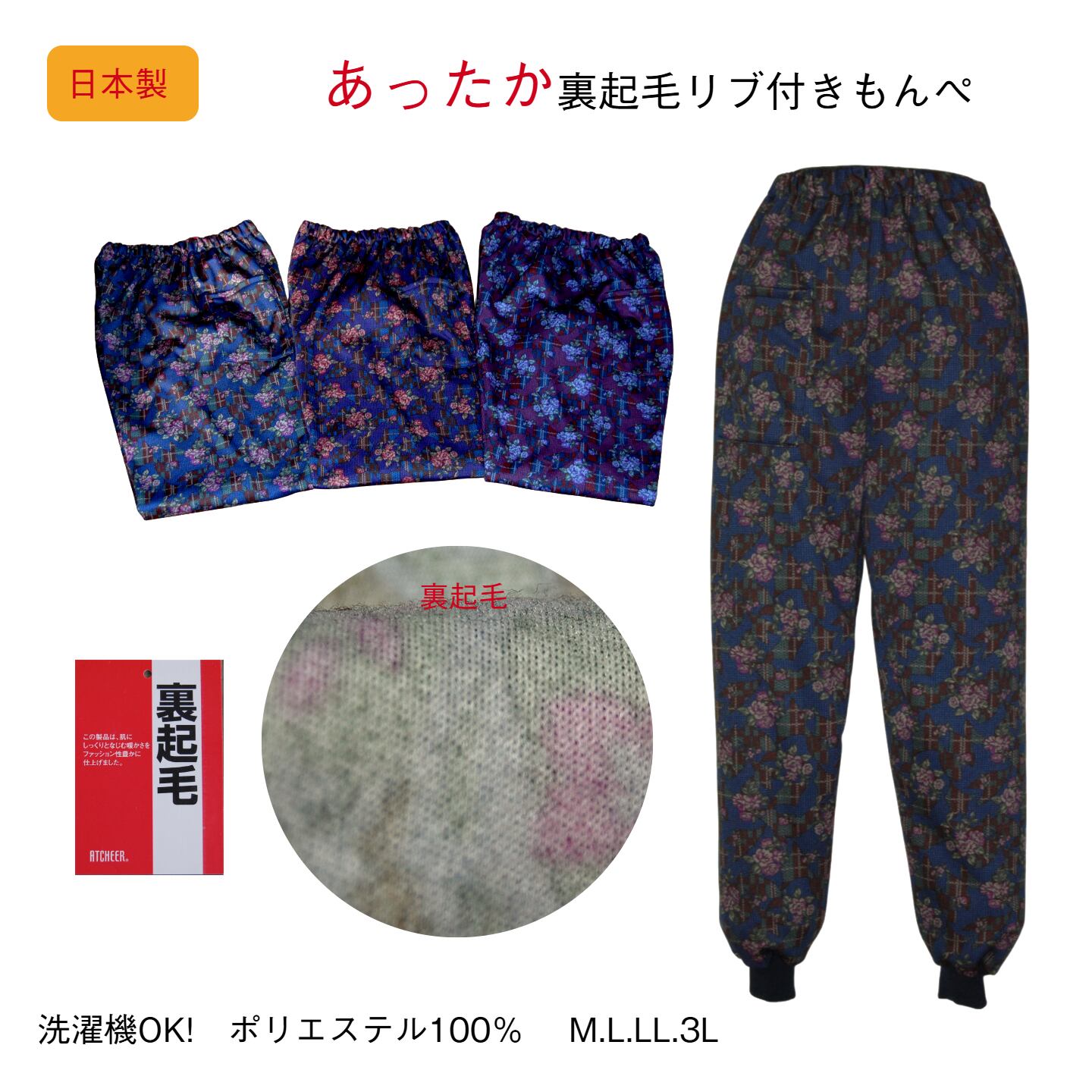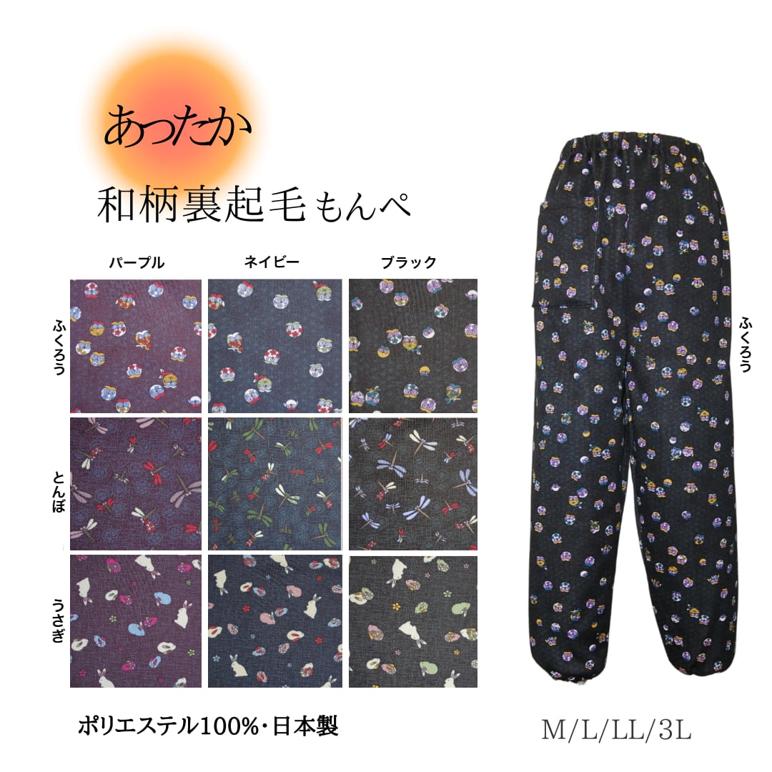 ウエスト/総ゴム ポケット/右側前1個 混率/ポリエステル100% 生産国/日本 寒い季節にぴったりの「あったかゆったり裏起毛もんぺパンツ」は、裏起毛による暖かさと、リラックスしたシルエットが特徴です。ゆったりとしたはき心地で、日常のコーディネートや部屋着、軽作業時にも最適なアイテムです。 サイズ ●M ウエスト64.0-70.0 ヒップ87.0-95.0 股下58.0 ●L ウエスト69.0-77.0 ヒップ92.0-100.0 股下60.0 ●LL ウエスト77.0-85.0 ヒップ97.0-105.0 股下62.0 ●3L ウエスト85.0-93.0 ヒップ102.0-110.0 股下65.0 上記のサイズは、スタッフによる平置きでの計測による実寸サイズが含まれています。 製造工程の関係上、±2㎝程の誤差があります。 ■ カラー/デザイン シンプルでありながら機能的なデザインのこのもんぺパンツは、あきのこない柄・カラー展開でゆったりなはき心地、普段着や部屋着、そして作業用としてもピッタリなもんぺパンツです。 ■ 素材/製造国 高品質なポリエステル100%を使用し、裏起毛による優れた保温性を実現しています。国内生産にこだわり、丁寧に仕立てられているため、安心してご着用いただけます。 ■ お手入れ/取り扱い注意事項 洗濯機での洗濯が可能ですが、ネット使用をお勧めします。お手入れが簡単で、いつでも快適な状態を保てる点がこの商品の魅力です。 ■ 発送・注文に関する情報や注意事項 ご注文後、通常1〜3営業日以内に発送を開始します。発送時には追跡番号をお知らせいたしますので、安心してお待ちください。配送には日本郵便「クリックポスト」を使用します。 ■ その他の情報や注意事項 商品に関するお問い合わせは、ショップのお問い合わせからお気軽にどうぞ。心よりお待ちしております。 この「あったかゆったり裏起毛もんぺパンツ」は、温かく快適な日常をサポートするアイテムです。ストレスフリーのリラックス感とゆったりスタイルを兼ね備えたこのパンツをぜひあなたのワードローブに加え、心地よい時間をお過ごしください。