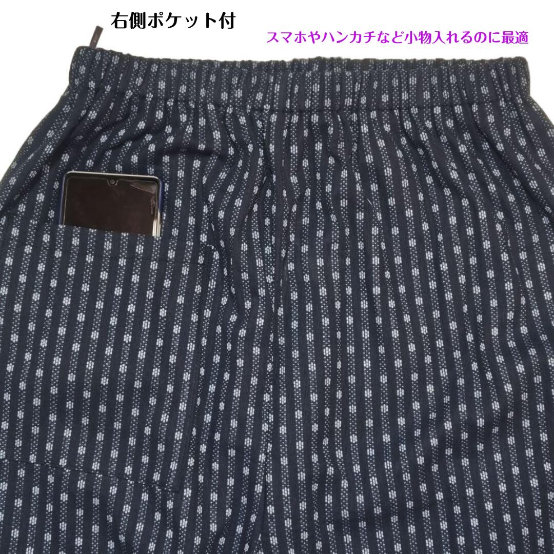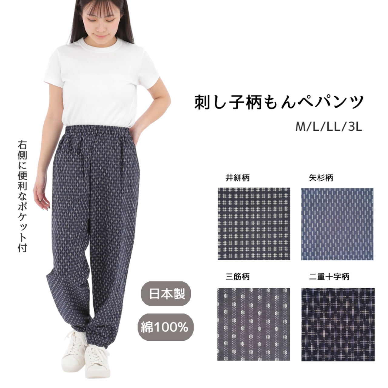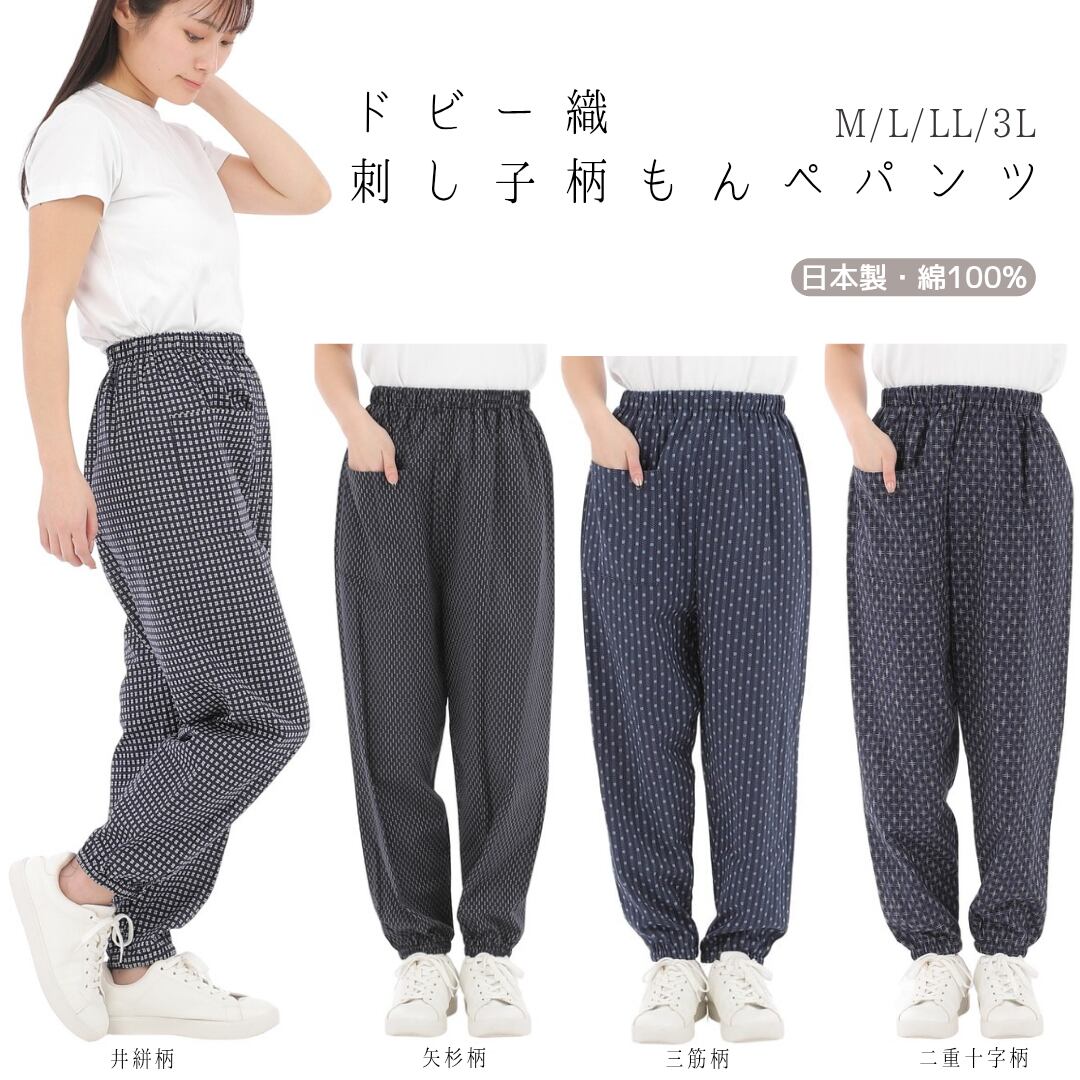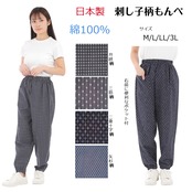 心地よさと快適な綿100%刺し子柄もんぺパンツこのパンツは伝統的な刺し子のデザインを取り入れながら、現代のライフスタイルにフィットするシルエットを実現しています。柔らかな綿素材が肌に優しく、動きやすさを考慮し、日常のさまざまなシーンで活躍します。また、独特の刺し子柄が美しいアクセントとなり、一枚でコーディネートの主役に。サイズ展開はM、L、LL、3Lの4種類で、リラックスした着用感を楽しみながら過ごせる1着です。