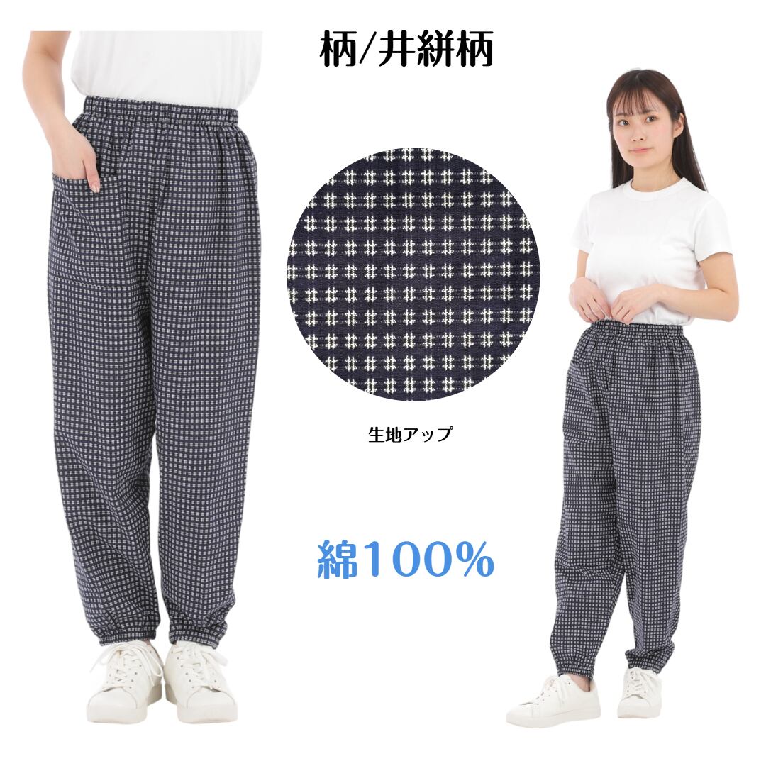 和のテイストが漂う「綿100%刺し子柄もんぺパンツ」は、刺し子柄をあしらった温もりのあるデザインが特徴です。ゆったりとしたシルエットで、リラックスした日常着や部屋着、そして軽作業時にも最適なアイテムです。