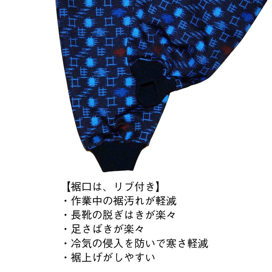 ナチュラルなかすり柄がやさしい印象を与え、裾リブのデザインで脚元をスッキリと見せる工夫や足さばきが楽々でストレスフリーのアイテムでルームウェアとしてだけでなく、普段着、作業など幅広く対応できる一着です。